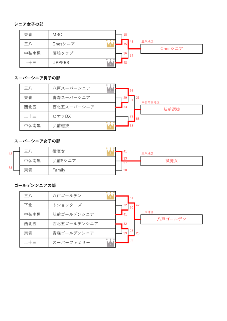 シニア男子、シニア女子、スーパーシニア女子、ゴールデンシニアの部にて、三八地区が優勝しています!